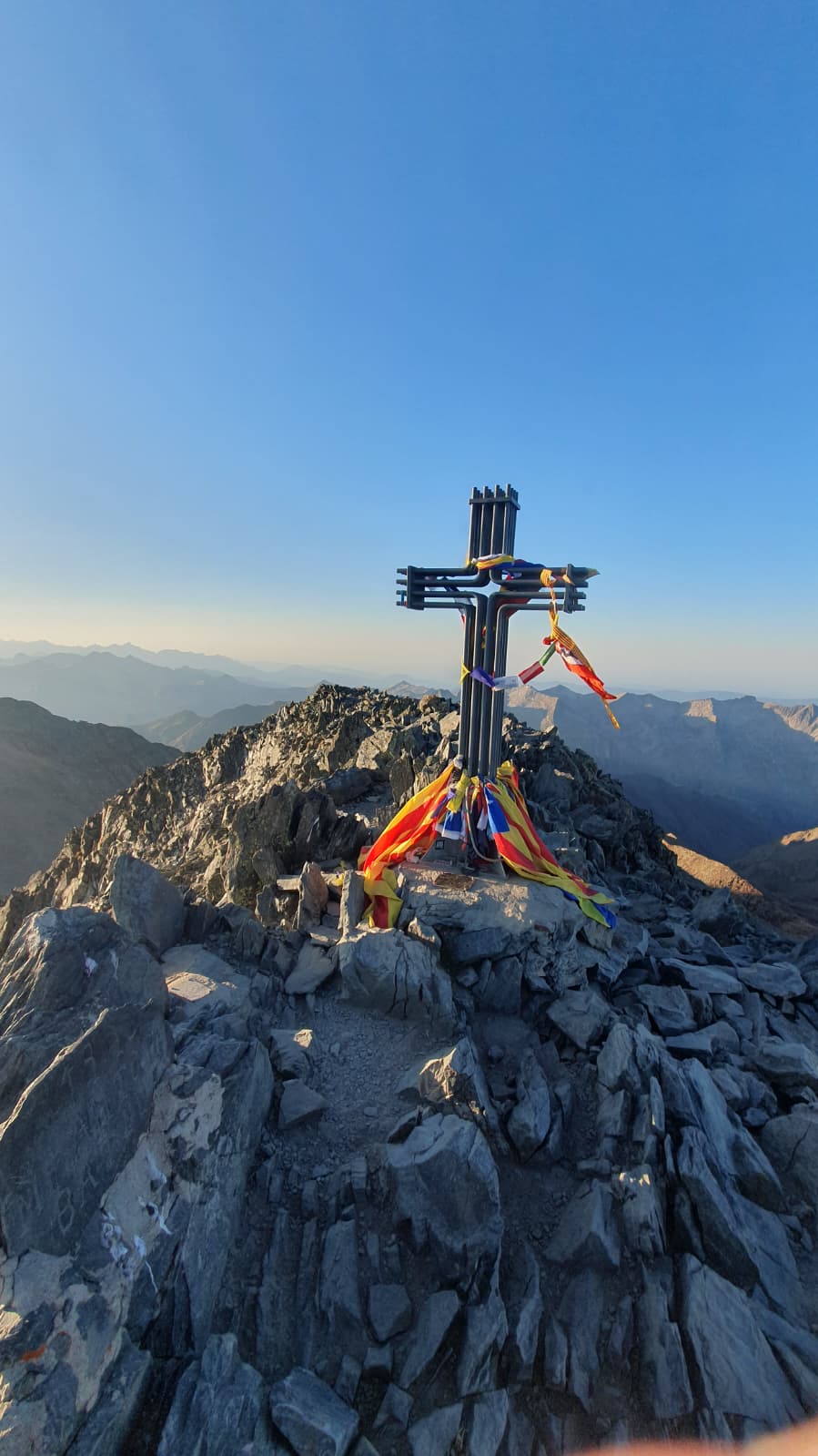 El diumenge afrontem l’ascensió final fins al cim de la Pica d’Estats, seguint l’itinerari clàssic. Durant el recorregut apareixen paisatges d’alta muntanya espectaculars i vistes privilegiades sobre cims com l’Aneto, el Comapedrosa o el Certascan. El recorregut presenta algun tram puntual delicat, com la desgrimpada equipada amb cadenes i alguna gripada després del coll de Sotllo, però en general és una ruta de senderisme d’alta muntanya sense dificultats tècniques destacables.